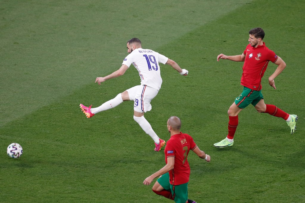 France's forward Karim Benzema scores the team's second goal during the UEFA EURO 2020 Group F football match between Portugal and France at Puskas Ar